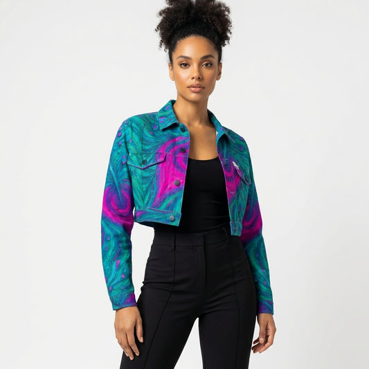 Cropped Jean Cotton Jacket Teal Peacock Feather