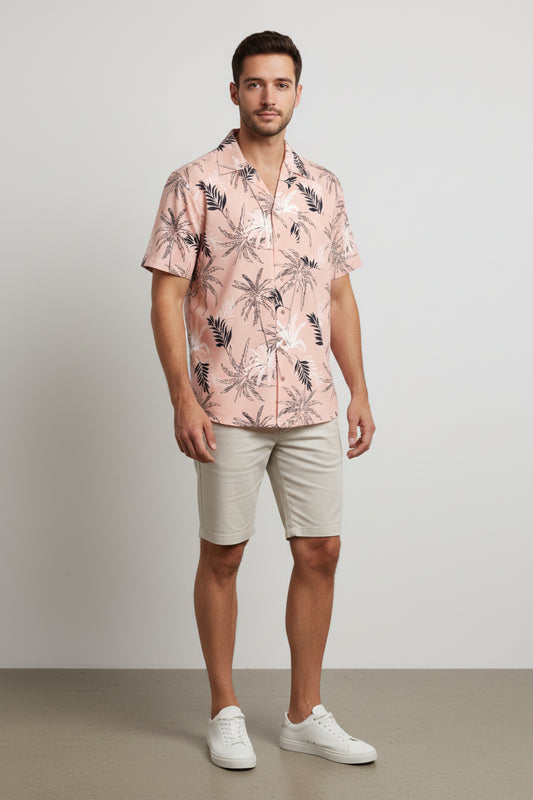 Pink Tropical Leaf Camp Collar/Bowling Shirt – Organic Cotton Twill