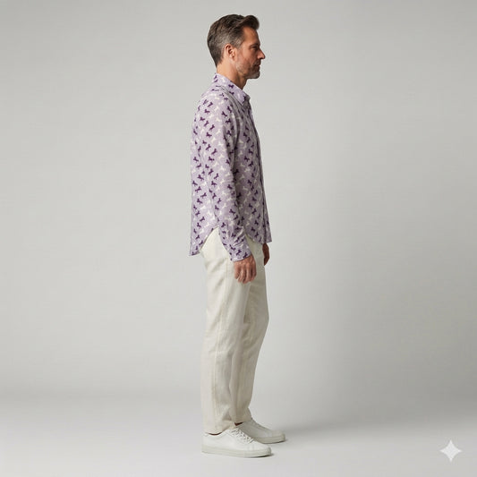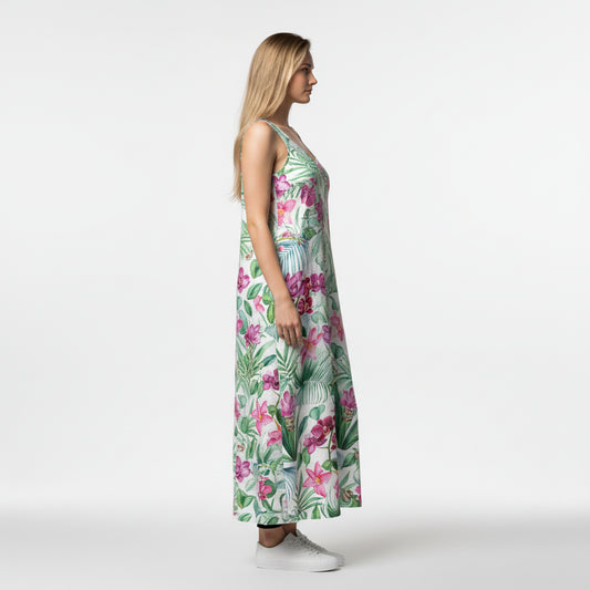 V-Neck A-Line Linen Dress – White Tropical Floral