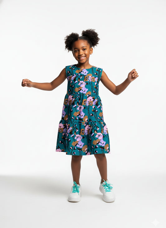 Kid's Ruffle Dress Without Lining in Dini's Teal Floral